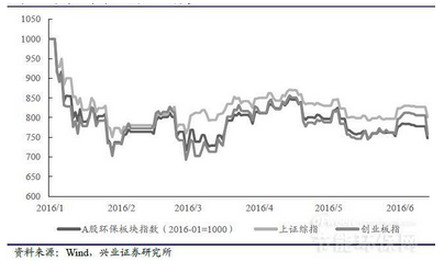 2016 年上半年估值重估,泥沙俱下。經(jīng)歷2015 年股市亢奮行情后,2016 年上半年出現(xiàn)較大幅度向下調(diào)整。年初至今,A 股環(huán)保指數(shù)、上證綜指、創(chuàng)業(yè)板指分別下跌25.3%、20.0%、24.3%。