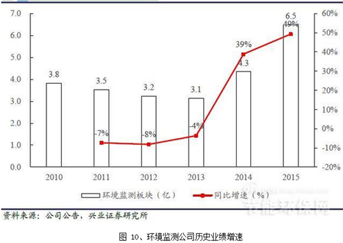 環(huán)境監(jiān)測:1)政策持續(xù)加碼,監(jiān)測體系天羅地網(wǎng):15 年8 月,國辦印發(fā)《生態(tài)環(huán)境監(jiān)測網(wǎng)絡(luò)建設(shè)方案》,要求到2020 年,環(huán)境監(jiān)測網(wǎng)絡(luò)實(shí)現(xiàn)環(huán)境質(zhì)量、重點(diǎn)污染源、生態(tài)狀況監(jiān)測全覆蓋,天羅地網(wǎng)成型。同時(shí)排污費(fèi)翻倍征收&稅法前提下,監(jiān)測定量化的重要性日益凸顯。結(jié)合互聯(lián)網(wǎng)+技術(shù),監(jiān)測服務(wù)將由傳統(tǒng).報(bào)數(shù).功能轉(zhuǎn)至.監(jiān)測-溯源-分析-治理.功能,密集化、精準(zhǔn)化必成趨勢;需求端由此將發(fā)生質(zhì)變。2)板塊增速:板塊增速持續(xù)上行,13、14、15 年全年扣非業(yè)績同比增長-4%、39%、49%。