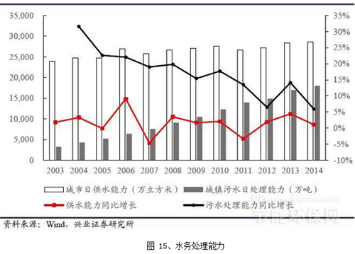 水處理工程、水務(wù)運(yùn)營:1)水務(wù)行業(yè)整體保持較快增長:城市供水能力保持了穩(wěn)定的增長,五年復(fù)合增長率達(dá)到1.2%,2013 年增長率為1.1%。城鎮(zhèn)污水處理能力達(dá)到較快增長,五年符合增長率達(dá)到11%,2013 年增長率為5.9%。水十條預(yù)計(jì)投資總額將達(dá)到2 萬億元,將從量變——側(cè)重大規(guī)模水務(wù)投資逐漸轉(zhuǎn)向質(zhì)變——提高排放水質(zhì)和加強(qiáng)水質(zhì)監(jiān)測等。我們強(qiáng)調(diào)水十條或是水處理提標(biāo)化的重要轉(zhuǎn)折點(diǎn);另外我們強(qiáng)調(diào)PPP 模式將是水處理工程行業(yè)的另一個(gè)變量,地方政府和水處理公司的結(jié)合將帶來地方水處理需求的集中釋放,這也是我們推薦水處理工程行業(yè)的一個(gè)重要的邏輯支點(diǎn)。2)水處理板塊增速:水處理工程板塊13、14、15 年扣非業(yè)績同比增長45%、18%、20%。