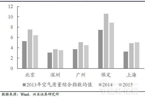 但是無論從直觀還是數(shù)據(jù)上,空氣質(zhì)量并無明顯改善。從直觀感受來看,今年冬季霧霾非常嚴(yán)重,以華北地區(qū)尤甚。從數(shù)據(jù)來看,重點(diǎn)城市2014 年、2015 年空氣質(zhì)量綜合指數(shù)相對2013 年有所惡化;中國的空氣質(zhì)量指數(shù)明顯比國外惡劣。
