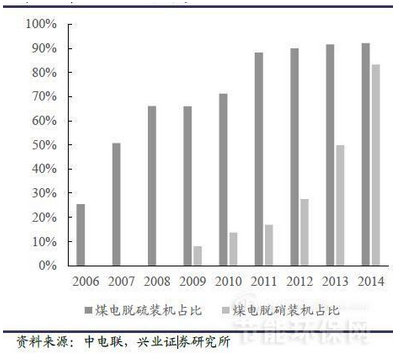 .補(bǔ)貼電價(jià)+排污費(fèi)+排放標(biāo)準(zhǔn).三重政策驅(qū)動(dòng)下,火電脫硫脫硝接近完成。1)政策驅(qū)動(dòng):2004年脫硫補(bǔ)貼電價(jià)1.5分/度出臺(tái)。2011年脫硝電價(jià)試點(diǎn)0.8分/度出臺(tái)。2013年脫硝電價(jià)1.0分/度出臺(tái)。2014年7月前,排放標(biāo)準(zhǔn)要求現(xiàn)有火電機(jī)組要求完成脫硫脫硝改造。2015年6月前,二氧化硫和氮氧化物排污費(fèi)征收標(biāo)準(zhǔn)調(diào)整至不低于每污染當(dāng)量1.2元;此次調(diào)整后,這兩項(xiàng)標(biāo)準(zhǔn)均翻了一倍。2)脫硫脫硝接近完成:截至2015年底,全國已投運(yùn)火電廠煙氣脫硫機(jī)組容量約8.2億千瓦,占全國煤電機(jī)組容量92.8%;已投運(yùn)火電廠煙氣脫硝機(jī)組容量約8.5億千瓦,占全國煤電機(jī)組容量的95.0%。