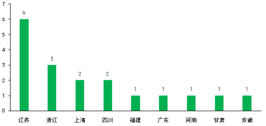 18家公司的地域分布主要集中在長(zhǎng)三角地區(qū),其中江蘇省有6家企業(yè),浙江有3家企業(yè),上海有2家企業(yè),共占比61%。