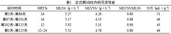 在模試運行期間,正式期的第53天將MBR內(nèi)的泥水混合液排出21 L,第75天和第83天各排出10L,其他時間處于不排泥狀態(tài),MBR內(nèi)的污泥性能見表1。由表1可見,在整個MBR運行的正式期,污泥體積指數(shù)(SVI)小于100 mL/g,表明污泥的沉降性能較好;MLVSS/MLSS較高,表明污泥的活性高;隨HRT的縮短,MLVSS增加,這是因為單位時間內(nèi)去除的有機物的量有所提高。MBR內(nèi)MLSS的平均值為5.52 g/L,MLVSS的平均值為4.78 g/L。