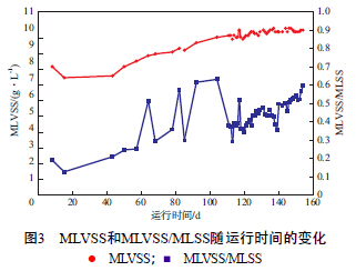 MLVSS和MLVSS/MLSS隨運行時間的變化見圖3。由圖3可見:在馴化期內(nèi),由于廢水中的DMSO對菌種有抑制作用,MLVSS逐漸減小;隨著活性污泥對廢水的逐漸適應(yīng),在正式期內(nèi)MLVSS隨運行時間的延長而逐漸增大;MLVSS/MLSS也是經(jīng)過馴化期的短暫降低后,在正式期隨運行時間的延長而逐漸增大,運行到第110天時(包括30 d馴化期)基本穩(wěn)定在0.89,說明污泥活性較高。
