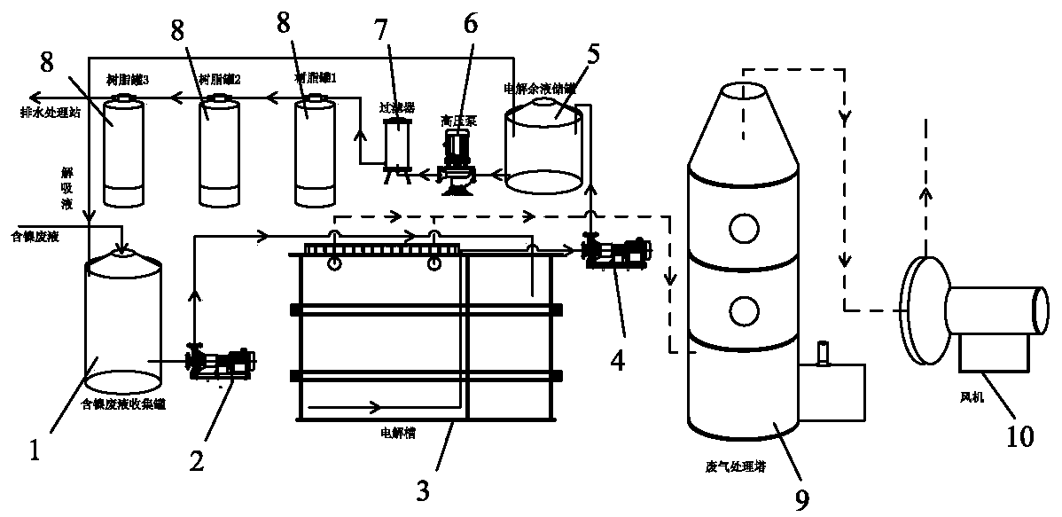 5.根據(jù)權(quán)利要求4所述的含鎳廢水鎳回收方法,其特征在于:步驟(2)中,電解產(chǎn)生的廢氣通入至廢氣處理塔,對廢氣處理后由風(fēng)機(jī)抽出外部。