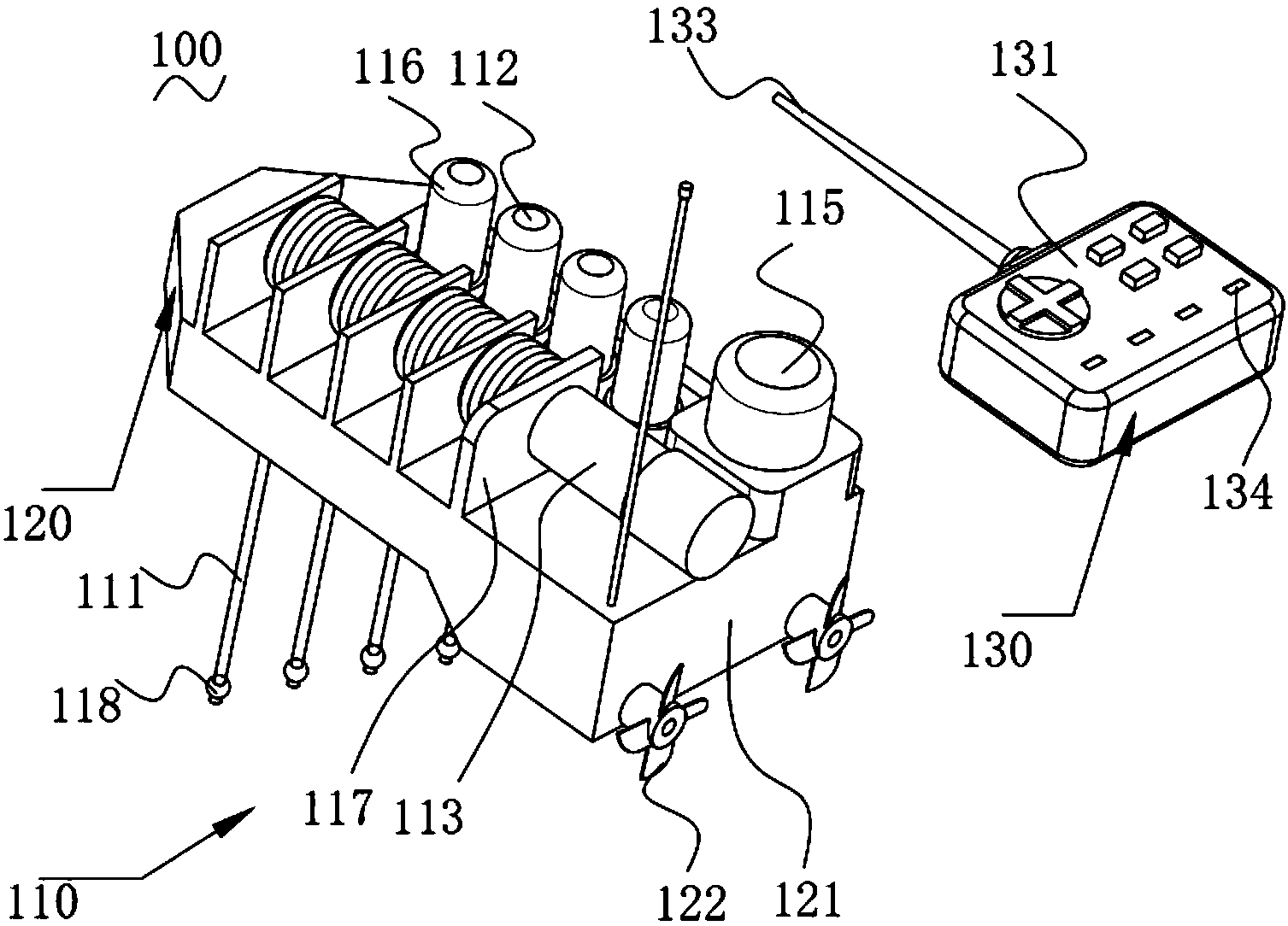 1、控制組件控制動(dòng)力組件工作,動(dòng)力組件驅(qū)動(dòng)采樣組件運(yùn)動(dòng)到水體指定位置進(jìn)行采樣。一方面,采樣組件包括一端伸入水體內(nèi)部取樣的若干個(gè)取樣管、連接于若干個(gè)取樣管用于盛裝取樣管取得的水樣的若干個(gè)試管、驅(qū)動(dòng)取樣管上下運(yùn)動(dòng)的采樣電機(jī)、連接于采樣電機(jī)輸出端的轉(zhuǎn)軸、連接于試管和取樣管用于抽真空的真空泵,所述取樣管中間部分繞設(shè)于轉(zhuǎn)軸上且自由端連接于試管,采樣電機(jī)通過(guò)轉(zhuǎn)軸帶動(dòng)取樣管上下運(yùn)動(dòng)到指定深度,真空泵對(duì)試管和取樣管抽真空,在真空吸力作用下,水樣通過(guò)取樣管進(jìn)入到試管中,完成水樣采集,由于設(shè)有多個(gè)取樣管,可一次完成采集多個(gè)水樣,采樣效率高;第二方面,動(dòng)力組件包括用于放置采樣組件的運(yùn)動(dòng)船、驅(qū)動(dòng)運(yùn)動(dòng)船運(yùn)動(dòng)的推進(jìn)機(jī)構(gòu),在推進(jìn)機(jī)構(gòu)作用下,采用組件能隨同運(yùn)動(dòng)船一起到達(dá)水體的任意位置,實(shí)現(xiàn)水體任意位置的采樣工作,適用范圍廣、使用方便。