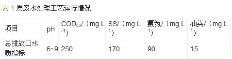 該工藝運(yùn)行初期處理效果較好,基本能達(dá)到《污水綜合排放標(biāo)準(zhǔn)》的三級標(biāo)準(zhǔn)要求。隨著生產(chǎn)規(guī)模擴(kuò)大及排放標(biāo)準(zhǔn)的提高,現(xiàn)城市污水處理廠不再接納該廠排放污水,該廠排放污水需滿足污水排放標(biāo)準(zhǔn)一級標(biāo)準(zhǔn),直接排放到附近河流。因此需對原工藝進(jìn)行技術(shù)改造。原廢水處理工藝運(yùn)行情況如表1所示。