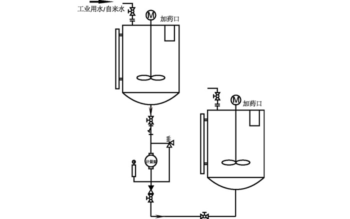 固體藥劑加入溶藥箱內(nèi),然后按比例加入工業(yè)水?dāng)嚢枞芙,由計量投加系統(tǒng)投加到投藥點。投加控制可采用手動方式,也可依據(jù)游動電荷測定儀或上位系統(tǒng)輸出的控制信號,進(jìn)行隨動控制,自動投加。