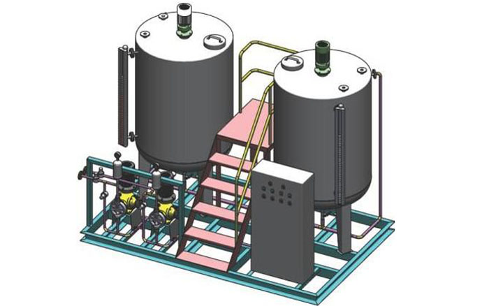 本裝置主要包括藥液計(jì)量泵系統(tǒng)、溶配系統(tǒng)、計(jì)量投加系統(tǒng)、安全系統(tǒng)和控制系統(tǒng)等五部分。
