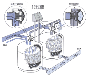 標(biāo)準(zhǔn)設(shè)備的設(shè)計(jì)主要采用了以色列進(jìn)口的過濾器專用三通閥,該閥專為介質(zhì)過濾器應(yīng)用而設(shè)計(jì),工作時(shí)原水經(jīng)三通閥直接進(jìn)入除氧器罐體內(nèi),出水自罐下部進(jìn)入總出水管。水中溶解氧與海綿鐵發(fā)生化學(xué)反應(yīng)產(chǎn)生不易溶于水的絮狀沉淀被海綿鐵顆粒攔截下來,沉淀積聚在罐體內(nèi)造成水流阻力增大,進(jìn)出口壓差增大,當(dāng)壓差增加到一定值時(shí)(0.05~ 0.07MPa),壓差表向控制器發(fā)出反沖洗信號(hào),A罐電磁閥加電,A罐頂部的三通閥動(dòng)作(自標(biāo)準(zhǔn)過濾狀態(tài)轉(zhuǎn)為反沖洗狀態(tài)),A罐進(jìn)水口關(guān)閉,反沖洗口打開;由于B罐此時(shí)處于工作狀態(tài),反沖洗水經(jīng)出水口進(jìn)入A罐底部,經(jīng)罐頂沖洗閥流向排水口,完成反洗動(dòng)作,控制器控制反洗時(shí)間以達(dá)到所要求的沖洗效果,一般為3~15分鐘。